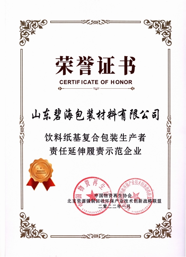 2022年1月12日,中國飲料紙基復合包裝可持續(xù)發(fā)展協(xié)作體2021年度會議在北京召開。會議對碧海公司在2021年推行環(huán)境友好包裝設計、開發(fā)可再生原料包裝、共建飲料紙基復合包裝回收協(xié)作體、規(guī)范回收利用等方面的工作給予了肯定,授予“飲料紙基復合包裝生產者責任延伸履責示范企業(yè)”榮譽稱號。